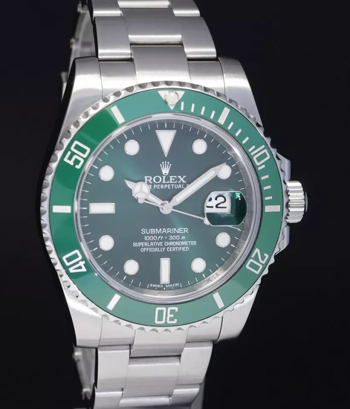 2018 Rolex Submariner “Hulk” 116610LV with a 40mm case, green dial, and green ceramic bezel. A discontinued and highly sought-after model offered in mint condition.