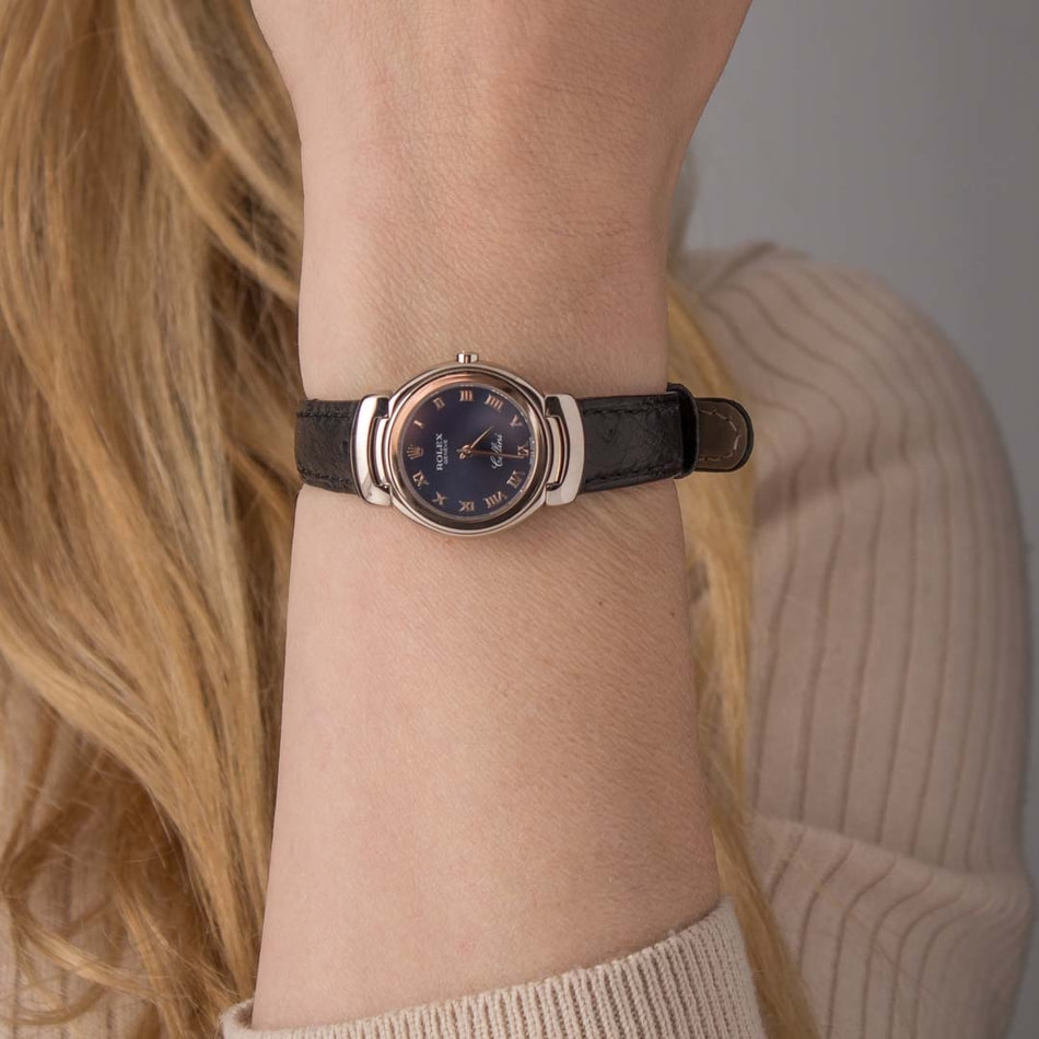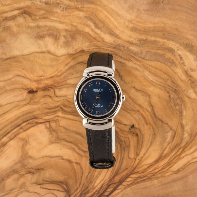 Pre-owned Rolex Cellini ref 6621 (1995) is a work of art, just like the masterpieces created by the collection’s muse, artist and sculptor Benvenuto Cellini. With its elegant design codes and exquisite materials, you will marvel at this watch whenever it touches your wrist. Furthermore, this model will never go out of style and will hold pride of place in your collection for a lifetime. If you’re looking for a distinctive gold Rolex with immense character, this ref. 6621 is the watch to buy. Features include a lovely white gold case flanked by curved end links and paired with a dramatic black leather strap. The time is displayed on an elegant blue dial via lustrous Roman numeral hour markers and hands.